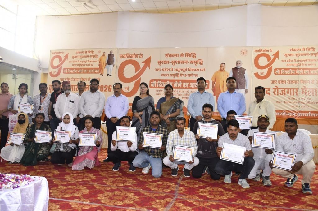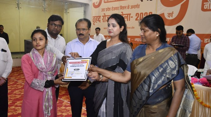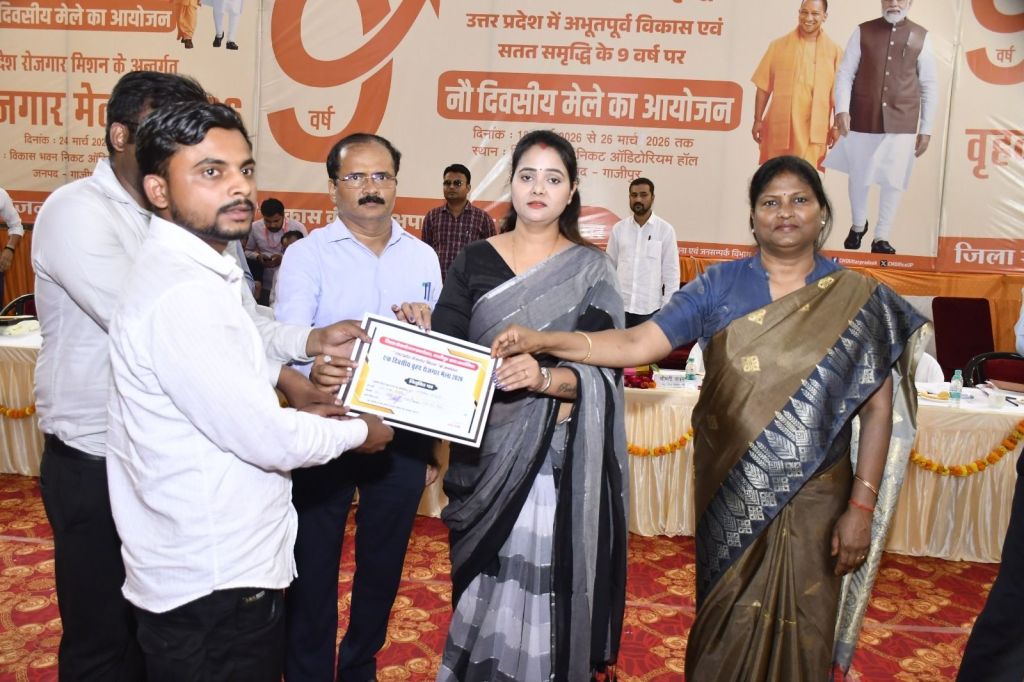 गाजीपुर।उत्तर प्रदेश सरकार के नव निर्माण के नौ वर्ष कार्यक्रम के अवसर पर उत्तर प्रदेश रोजगार मिशन के अधीन सेवायोजन कार्यालय द्वारा 24 मार्च को वृहद रोजगार मेला का आयोजन ऑडिटोरियम परिसर विकास भवन के पास में किया गया। मेला का शुभारंभ जिला पंचायत अध्यक्ष सपना सिंह और नगर पालिका अध्यक्ष सरिता अग्रवाल द्वारा फीता काटकर किया गया।