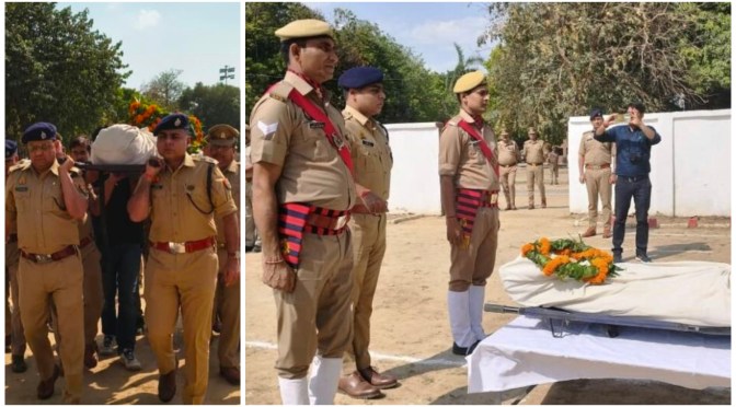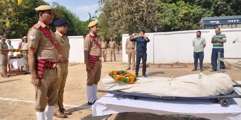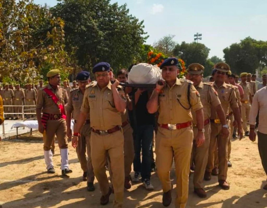 गाजीपुर। थाना कोतवाली में तैनात आरक्षी रमन सिंह पुत्र राम नारायण सिंह निवासी गोरखपुर की 06/07 अप्रैल की मध्यरात्रि को थाना बिरनों क्षेत्र में सड़क दुर्घटना में गंभीर रूप से घायल हो गए थे जिनका गुरुवार को बीएचयू ट्रामा सेंटर वाराणसी में ईलाज के दौरान दु:खद मृत्यु हो गई । उक्त आरक्षी के शव को गुरुवार को शहीद स्मृति स्थल पुलिस लाइन में लाया गया। जहां पुलिस अधीक्षक डॉ. इरज राजा, अपर पुलिस अधीक्षक ग्रामीण, क्षेत्राधिकारी नगर, क्षेत्राधिकारी सैदपुर ,प्रतिसार निरीक्षक एवं प्रभारी निरीक्षक कोतवाली महेंद्र सिंह सहित अन्य उपस्थित पुलिसकर्मियों द्वारा नम आँखों से उन्हें राजकीय सम्मान, श्रद्धांजलि व कंधा देकर उनके शव को उनके मूल निवास हेतु रवाना किया गया।
