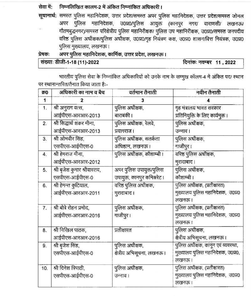 लखनऊ। उत्तर प्रदेश में 11 आईपीएस अफसरों का हुआ तबादला। प्रदेश सरकार ने शुक्रवार की रात 11 आइपीएस अधिकारियों का तबादला कर दिया है। इसमें गाजीपुर जिले के पुलिस अधीक्षक रोहन पी बोत्रे का भी नाम शामिल हैं। बता दें कि पुलिस अधीक्षक रोहन पी बोत्रे का तबादला कर मुख्यालय पुलिस महानिदेशक से संबद्ध कर दिया गया है। उनके स्थान पर पुलिस अधीक्षक सतर्कता अधिष्ठान लखनऊ से ओमवीर सिंह को गाजीपुर का नया एसपी नियुक्त किया गया है।