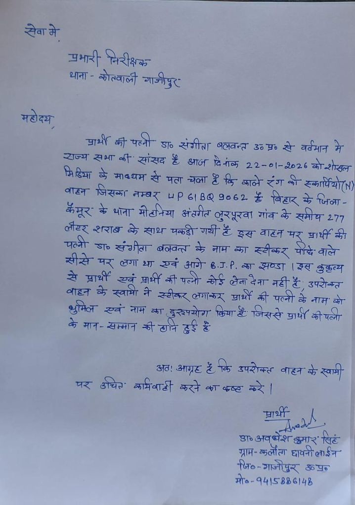 ग़ाज़ीपुर। राज्यसभा सांसद डा. संगीता बलवंत के पति डा.. अवधेश ने सदर कोतवाली में तहरीर देते हुए बिहार के कैमूर जिले में 277 लीटर शराब के साथ पकड़े गए वाहन मामले में कार्यवाही की माग की है। इस वाहन पर सांसद डॉ. संगीता बलवंत के नाम का स्टिकर और भाजपा का झंडा लगा था।