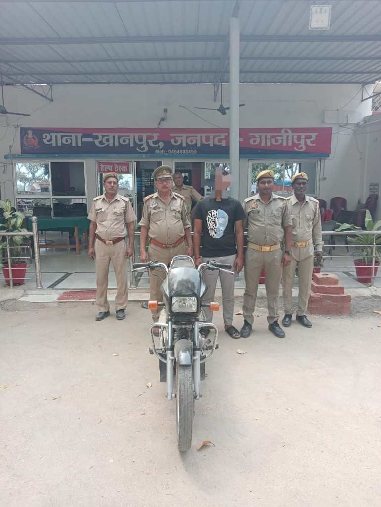 गाजीपुर। थाना खानपुर पुलिस ने शुक्रवार को एक अभियुक्त गिरफ्तार किया। बता दें कि थाना खानपुर पुलिस ने वाहन चेकिंग के दौरान बिहारीगंज डगरा रेलवे क्रासिंग अनौनी मार्ग से शुक्रवार की देर रात रोहित गोस्वामी उर्फ बाबा पुत्र घूरहु निवासी ग्राम भगवानपुर पोस्ट हरौड़ा थाना तरवां जनपद आजमगढ़ को गिरफ्तार कर लिया। गिरफ्तार अभियुक्त के कब्जे से एक देशी तमंचा, तीन जिन्दा कारतूस व एक मोटरसाइकिल बरामद किया गया। अवैध तमंचा व कारतूस बरामदगी के सम्बन्ध मे थाना स्थानीय पर मुकदमा पंजीकृत कर थाना खानपुर पुलिस द्वारा अग्रिम विधिक कार्यवाही की जा रही है। गिरफ्तार करने वाली पुलिस टीम में सिधौना चौकी प्रभारी फूलचन्द पाण्डेय, कांस्टेबल आकाश सिंह थाना खानपुर, का0 अनूप पाठक थाना खानपुर और का0 रिंकू कुमार थाना खानपुर शामिल रहे।