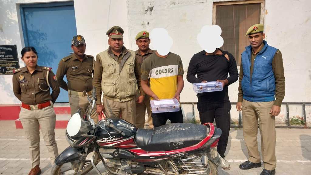 गाजीपुर। थाना कोतवाली पुलिस ने दो अभियुक्तों को गिरफ्तार कर उनके पास से तमंचा, कारतूस और चोरी की एक मोटर साइकिल बरामद किया। रविवार को चेकिंग अभियान के दौरान कोतवाली प्रभारी निरीक्षक तेज बहादुर सिंह ने उपनिरीक्षक सुनील कुमार शर्मा सहित अन्य पुलिस कर्मियों के साथ थाना कोतवाली क्षेत्र के बुद्धा हास्टल के लार्ड कार्नवालिस रोड के पास से संदीप यादव पुत्र दिनेश यादव निवासी बसनियाँ थाना भाँवरकोल और विवेक राय उर्फ रावण पुत्र मुन्ना राय निवासी गरूआ मकसूदपुर थाना सुहवल को गिरफ्तार कर लिया। गिरफ्तार अभियुक्तों के पास से अवैध 2 तमंचा 315 बोर, 2 जिन्दा कारतूस 315 और मऊ से चोरी की गयी एक मोटर साइकिल बरामद की गई। गिरफ्तार अभियुक्तों के उपर जिले के विभिन्न थानों पर विभिन्न धाराओं में मुकदमा दर्ज है। गिरफ्तारी करने वाले पुलिस में विश्वेरगंज चौकी प्रभारी अमित कुमार पाण्डेय सहित अन्य पुलिस कर्मी शामिल रहे।