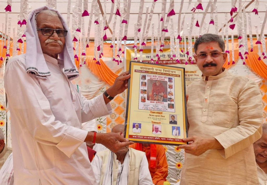 गाजीपुर। माँ कामाख्या की स्थापना करने वाले बाबा गंगेश्वर की स्मृति में गुरुवार को बाबा गंगेश्वर जन कल्याण समिति के तत्वाधान में सिद्ध मां कामाख्या धाम मंदिर गहमर के प्रांगण में आयोजित समारोह के अवसर पर बाबा गंगेश्वर के जीवन पर आधारित पुस्तक “वंशावली ग्रंथ” का विमोचन कार्यक्रम के मुख्य अतिथि उत्तर प्रदेश सरकार के पूर्व मंत्री विजय मिश्रा ने किया। पुस्तक विमोचन उपरांत आगे श्री मिश्र ने कहा कि बाबा गंगेश्वर मां भगवती के अनन्य साधक होने के साथ ही साथ एक संकल्प वान एवं साहसी व्यक्ति थे।