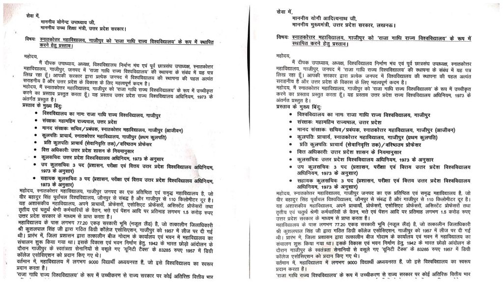 गाजीपुर। विश्वविद्यालय निर्माण मंच के अध्यक्ष एवं पूर्व छात्रसंघ उपाध्यक्ष दीपक उपाध्याय ने शनिवार को मुख्यमंत्री योगी आदित्यनाथ और उच्च शिक्षा मंत्री के नाम संबोधित एक पत्र डाक के माध्यम से भेजा। इस पत्र में स्नातकोत्तर महाविद्यालय गाजीपुर को राजा गाधि राज्य विश्वविद्यालय’ के रूप में स्थापित करने का प्रस्ताव दिया गया है, साथ ही आगामी विधानसभा बजट में इसकी घोषणा कराने का आग्रह किया गया है। श्री उपाध्याय ने बताया कि गाजीपुर के छात्रों का भविष्य दांव पर है। जनपद में एक भी विश्वविद्यालय नहीं होने से यहां के छात्रों को अनेकों समस्याओं का सामना करना पड़ता है। गरीब और मध्यम वर्ग के छात्र उच्च शिक्षा के लिए बाहर जाने में असमर्थ हैं, जिससे उनका भविष्य अधर में है। ‘राजा गाधि राज्य विश्वविद्यालय’ की स्थापना से छात्रों को अपने ही जनपद में गुणवत्तापूर्ण शिक्षा प्राप्त करने का अवसर मिलेगा। छात्र नेता ने कहा कि स्नातकोत्तर महाविद्यालय विश्वविद्यालय के लिए उपयुक्त है।
