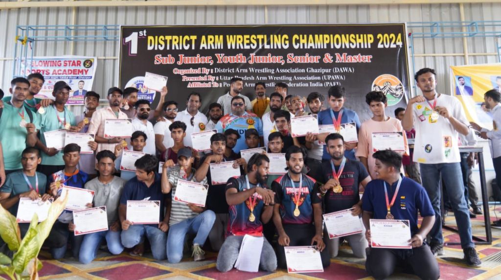 गाजीपुर। रविवार की शाम शहर के लार्ड बुद्धा पैलेस छावनी लाइन में प्रथम जिला स्तर की आर्म रैसलिंग की प्रतियोगिता का आयोजन किया गया। जिसमें जिले के 150 खिलाड़ियों ने हिस्सा लिया। सिद्धार्थ मौर्य सीनियर वर्ग में और रमेश साहनी जूनियर वर्ग अपने प्रतिद्वंदियों को हराकर चैंपियन के ख़िताब पर कब्जा जमाया। प्रतियोगिता का शुभारंभ संस्था के अध्यक्ष डॉ चंद्रभान चौबे एवं सचिव रामप्रवेश कुशवाहा ने हनुमान जी की आरती और वंदन करके किया। इस कार्यक्रम में डॉ अवनीश मिश्रा, ओम प्रकाश सिंह यादव, अभय राज ,मास्टर रमेश यादव ने प्रतियोगिता में सम्मिलित होकर प्रतियोगिता का मान बढ़ाया। प्रतियोगिता के अंत में समापन अंतरराष्ट्रीय खिलाड़ी एवं जिला ओलंपिक संघ के सचिव अमित राय एवं डॉ राजकुमार चौबे ने संयुक्त रूप से किया। इस प्रतियोगिता का संचालन हरेंद्र विक्रम ने किया।प्रतियोगिता को सफल बनाने में संस्था के पदाधिकारी शमशेर खान, एडवोकेट पवन पांडे, दिलीप कुशवाहा, नेहा राय श्याम प्रवेश कुशवाहा, अब्दुल मलिक का योगदान रहा। प्रतियोगिता की जानकारी आयोजन सचिव संजय सिंह एवं कोषाध्यक्ष मोहम्मद सरवर डेजी ने दिया।