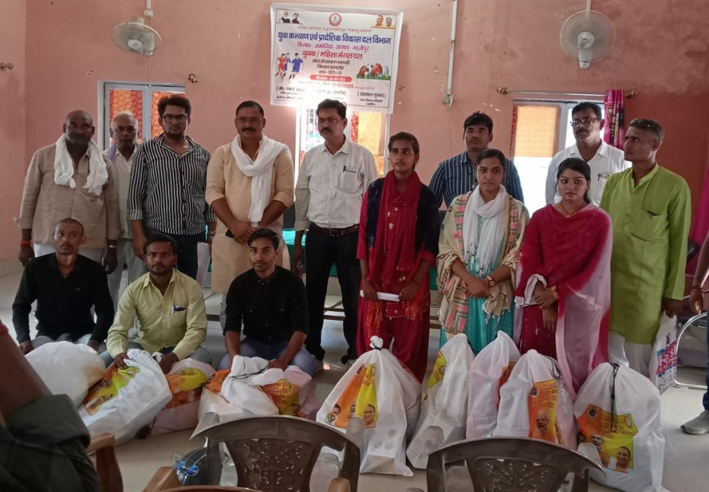 गाजीपुर। युवा कल्याण विभाग विकास खंड जमानिया के अंतर्गत विकास खण्ड जमानिया सभागार में ब्लॉक प्रमुख प्रतिनिधि संतोष कुशवाहा की उपस्थिति में सोमवार को ग्राम पंचायत तियारी, रोहूँन, हमीदपुर, देवाबैरानपुर के युवक एवम महिला मंगल दलों को खेल सामग्री वितरित की गई। इस अवसर पर विकास खंड अधिकारी जमानिया यशवंत कुमार, ए0 डी0ओ पंचायत अरुण कुमार पांडेय, ब्लॉक के उर्दू अनुवादक, पी0आर0डी0 जवान उपस्थित रहे। कार्यक्रम का संचालन क्षेत्रीय युवा कल्याण अधिकारी वकार खान ने किया।