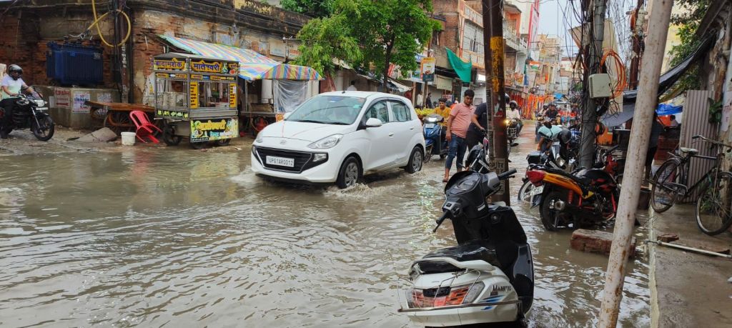 गाजीपुर। शहर में चल रहे सीवर पाइपलाइन के चलते बारिश का पानी नगर में हर जगह इकट्ठा हो गया जिससे आम जनजीवन अस्त व्यस्त हो गया। जल निगम द्वारा पाइप लाइन और उसका चेंबर बनाने के लिए खोदे गए गड्ढे से नगर पालिका क्षेत्र के सड़कों का बुरा हाल हो गया है। मेन बाजार सहित सड़कों में बरसाती पानी से सड़क व गली लबालब हो गईं। बरसाती पानी के साथ नालों व नालियों का गंदा पानी भी सड़कों पर आ गया। पानी निकालने के लिए दुकानदारों को परेशानियों का सामना करना पड़ा। बता दें कि नगर में कल शनिवार को शाम 4:30 बजे से शुरू हुई बारिश 5 बजे तक लगातार जारी रही। सुबह से ही नगर का बाजार, गली, चौराहा, सड़कें नाले, नालियां और चौक सीवर पाइपलाइन कार्य के चलते लबालब भरी रही। बारिश के कारण नगरवासियों को जलभराव की समस्या का सामना करना पड़ रहा है। जलभराव और पाइप लाइन कार्य के कारण वाहनों को निकलने में दिक्कतें होती रही। लोगों को गड्ढों व नालियों का अंदाजा जलभराव में नहीं हो पा रहा था। आसपास के लोग राहगीरों को चिल्लाकर सावधान कर रहे थे।